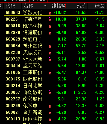 下跌方面,算力概念股走低,拓维信息、浙数文化、航锦科技跌停。