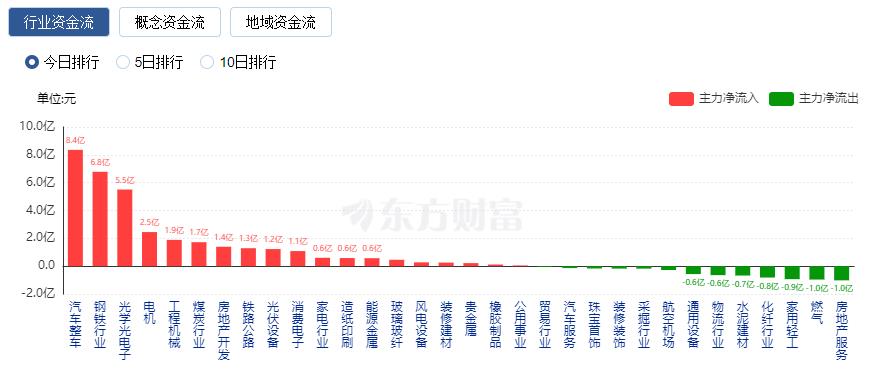 行业资金方面,截至收盘,汽车整车、钢铁行业、光学光电子等净流入排名靠前,其中汽车整车净流入8.36亿。