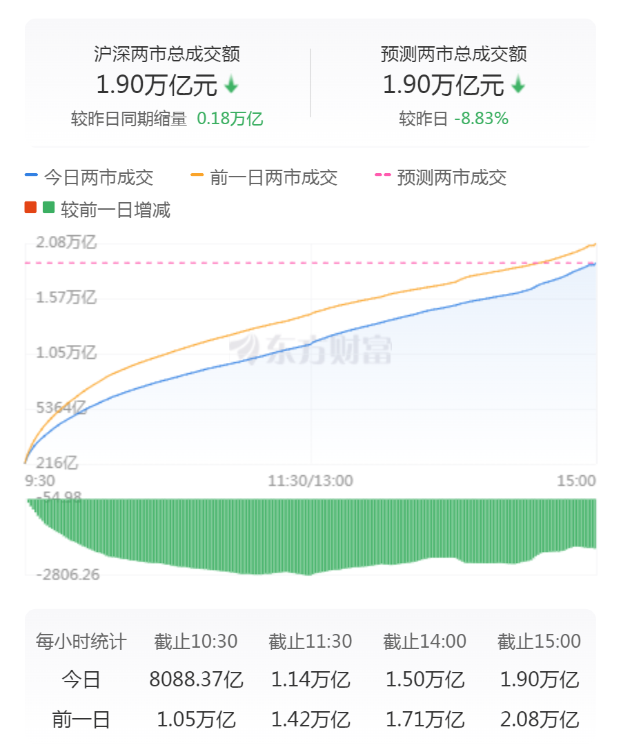 A股三大指数今日集体回调,截止收盘,沪指跌0.80%,收报3346.04点;深证成指跌1.17%,收报10854.50点;创业板指跌1.13%,收报2240.59点。沪深两市成交额达到18968亿,较昨日缩量1837亿。