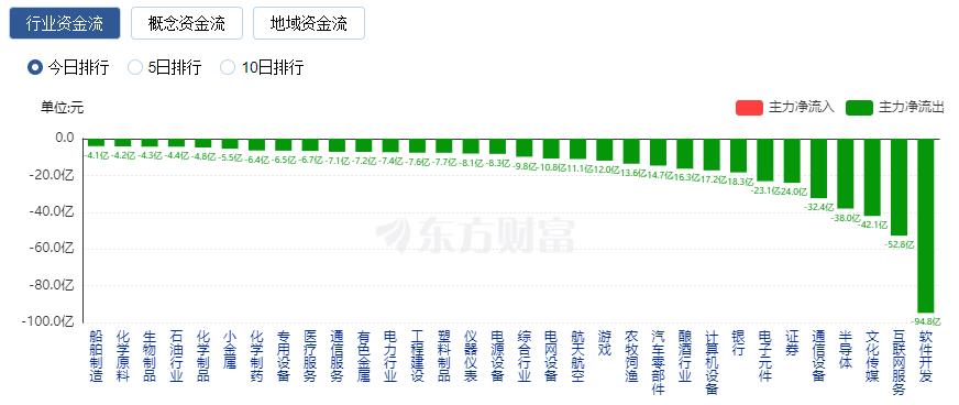 净流出方面,软件开发、互联网服务、文化传媒等净流出排名靠前,其中软件开发净流出94.83亿元。