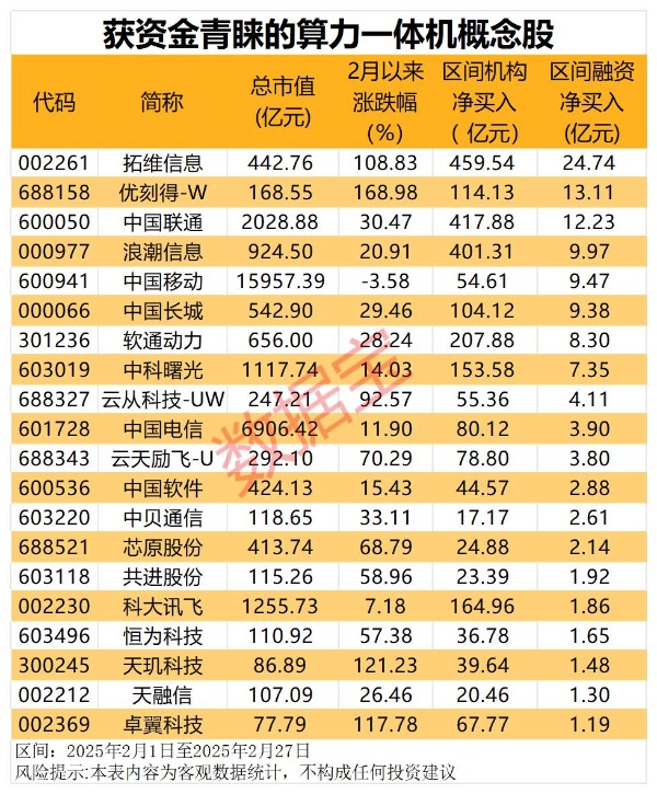 从资金面来看,2月以来有20只概念股获杠杆资金净买入超亿元,拓维信息净买入金额高达24.74亿元。其间,机构资金也大手笔推波助澜,拓维信息、中国联通、浪潮信息均获超400亿元的净买入。