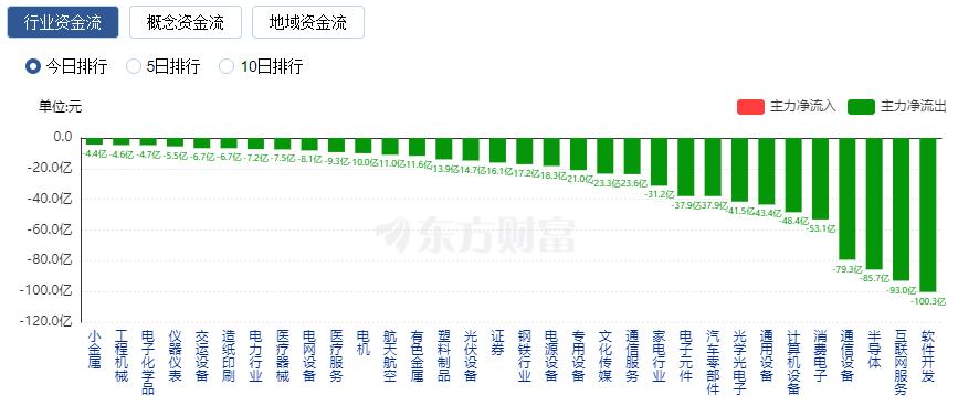 净流出方面,软件开发、互联网服务、半导体等净流出排名靠前,其中软件开发净流出100.3亿元。