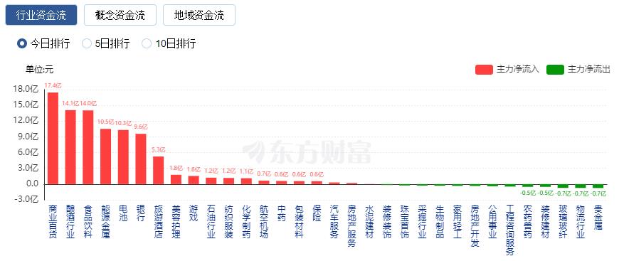 行业资金方面,截至收盘,商业百货、酿酒行业、食品饮料等净流入排名靠前,其中商业百货净流入17.44亿。