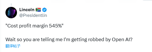 有网友将DeepSeek与OpenAI进行对比,表示:“‘成本利润率545%’,等一下,所以你是说我被OpenAI抢劫了?”