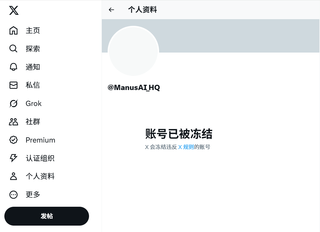 3月7日,记者发现这两天大火的AI应用Manus在X平台的账号被冻结。