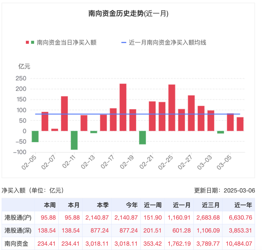 在DeepSeek的激发下,春节后的A股和港股市场演绎出了科技热,南向资金加速涌入港股。3月6日,在港股大涨背景下,南向资金在前期颇高的买入量下继续加仓,净买入超65亿元。港股2025年开局连涨两个月,恒生综合指数在2月录得12.8%的升幅,追踪中国香港上市龙头科技企业的恒生科技指数在2月上涨17.9%。