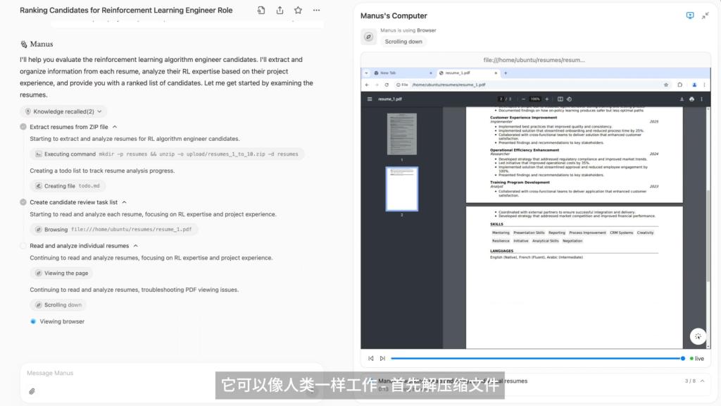 以筛选简历的任务为例,用户上传多份简历后,Manus就会浏览文件并记录重要信息,为用户提供排名建议、相关候选人简历和评估标准,还有按照用户要求创建的表格。在这个过程中,用户可以随时给出新的指令,例如添加其他简历。