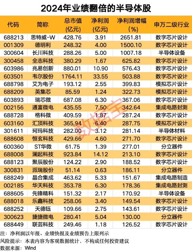 2024年半导体板块上市公司业绩亮眼。以年报、业绩快报及预告净利润上限为序来看,25股业绩翻倍。除此之外,上海贝岭、中微半导、江波龙、佰维存储等多只个股扭亏为盈。