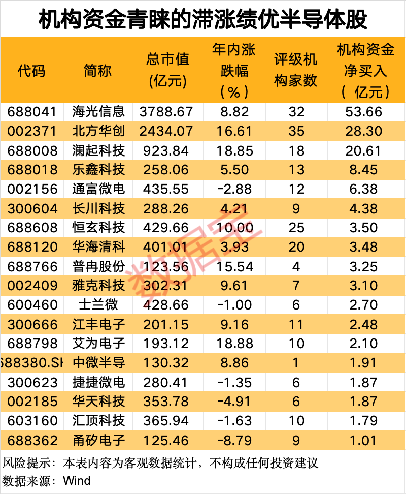 基本面业绩大涨或大幅扭亏的绩优股,更能获得资金的青睐。今年以来机构资金对滞涨且业绩优质的半导体股青睐有加。