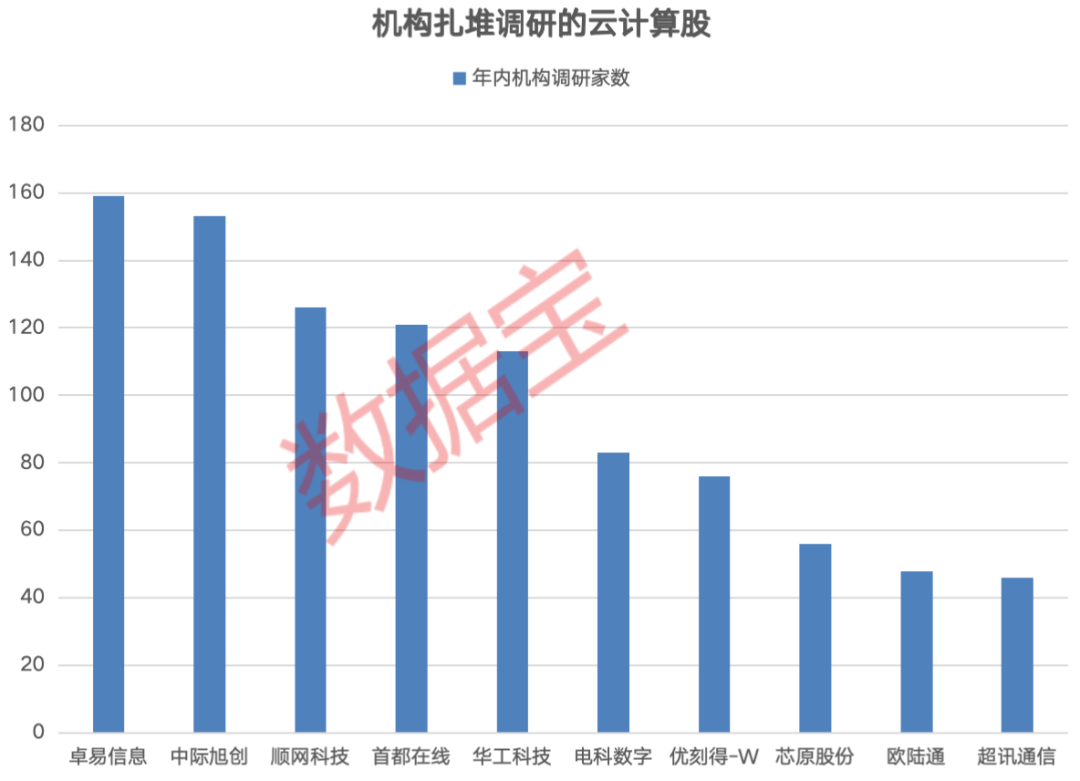 云计算概念股获得机构密切关注,开年以来39股获得机构调研,超过总数的三成,其中卓易信息、中际旭创、顺网科技、首都在线、华工科技5股获百家以上机构调研。