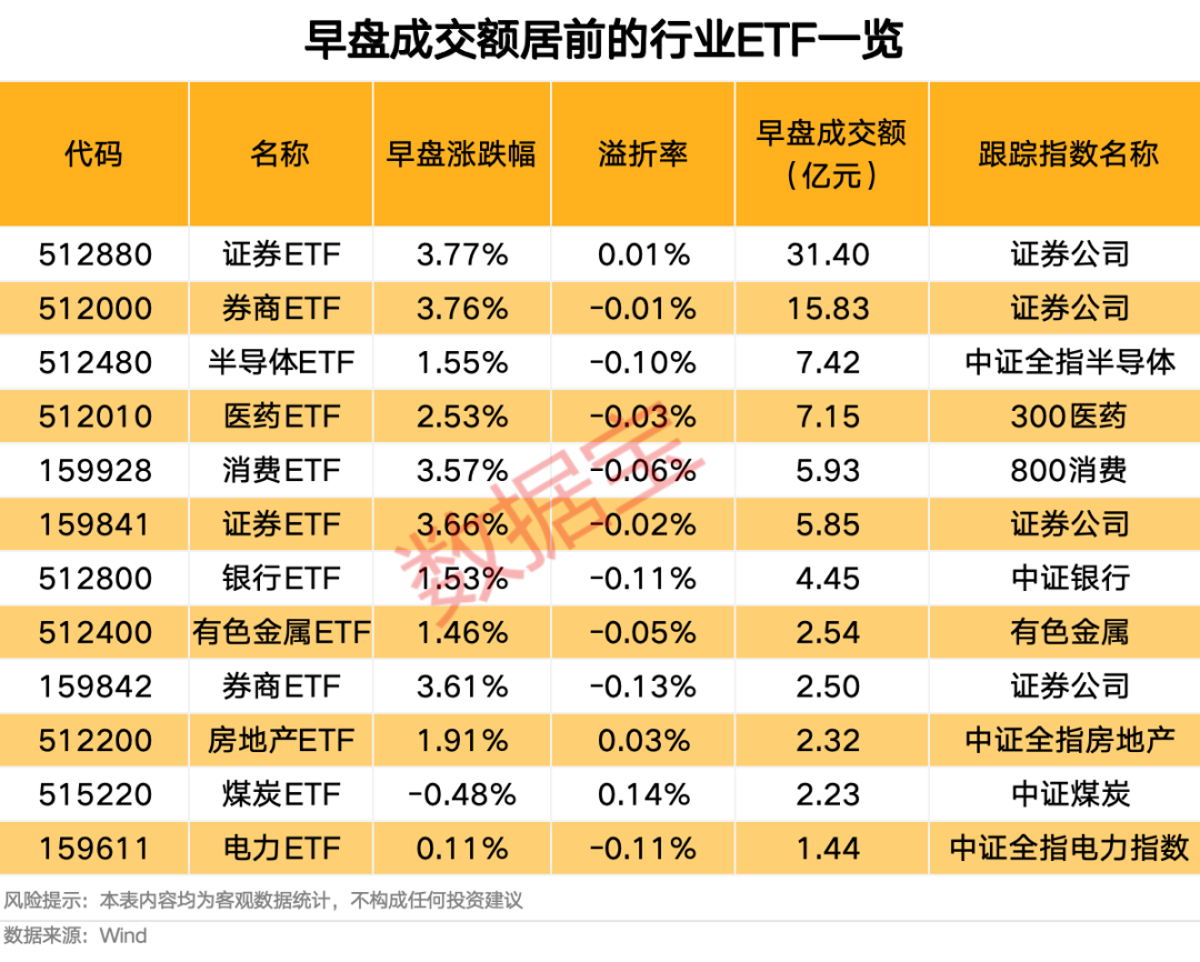 白酒股震荡走高,舍得酒业、酒鬼酒涨停,岩石股份、泸州老窖、水井坊、五粮液等均涨逾3%。ETF基金方面,据证券时报·数据宝统计,今日早盘涨幅居前的行业ETF清一色来自消费、证券领域。华安中证申万食品饮料ETF早盘上涨5.31%,涨幅位居首位。从成交额来看,早盘国泰中证全指证券公司ETF、华宝中证全指证券ETF成交额居前,分别成交31.4亿元和15.83亿元。