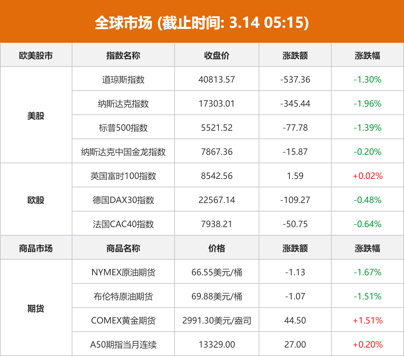 美股市场:受美国总统特朗普、商务部长卢特尼克、财政部长贝森特连番表态冲击市场情绪的影响,美股三大指数13日下跌,跌幅均超1%。截止当天收盘,道琼斯工业平均指数比前一交易日下跌537.36点,收于40813.57点,跌幅为1.30%;标准普尔500种股票指数下跌77.78点,收于5521.52点,跌幅为1.39%;纳斯达克综合指数下跌345.44点,收于17303.01点,跌幅为1.96%。