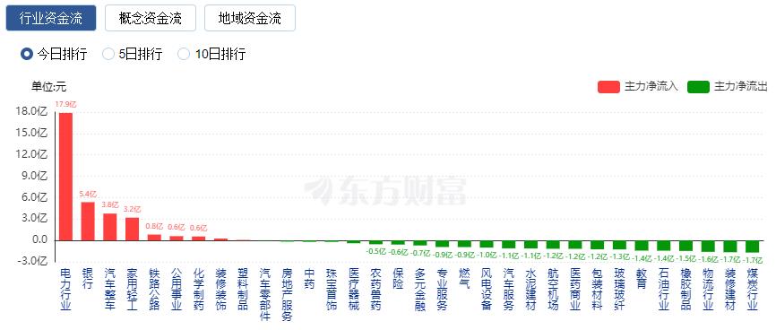 行业资金方面,截至收盘,电力行业、银行、汽车整车等净流入排名靠前,其中电力行业净流入17.88亿。