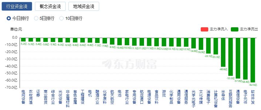 净流出方面,软件开发、电子元件、通信设备等净流出排名靠前,其中软件开发净流出62.46亿元。