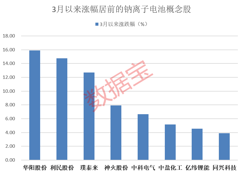据证券时报·数据宝统计,A股钠离子电池概念股中,宁德时代、亿纬锂能、中国长城、神火股份等股的市值规模居前。3月以来,钠离子电池板块有所回调,概念指数累计下跌2.55%,华阳股份、利民股份、璞泰来的股价涨幅居前,分别上涨15.89%、14.75%、12.72%。盟固利、鹏辉能源、中国长城、厦钨新能的股价跌幅居前,月内均下跌超10%。