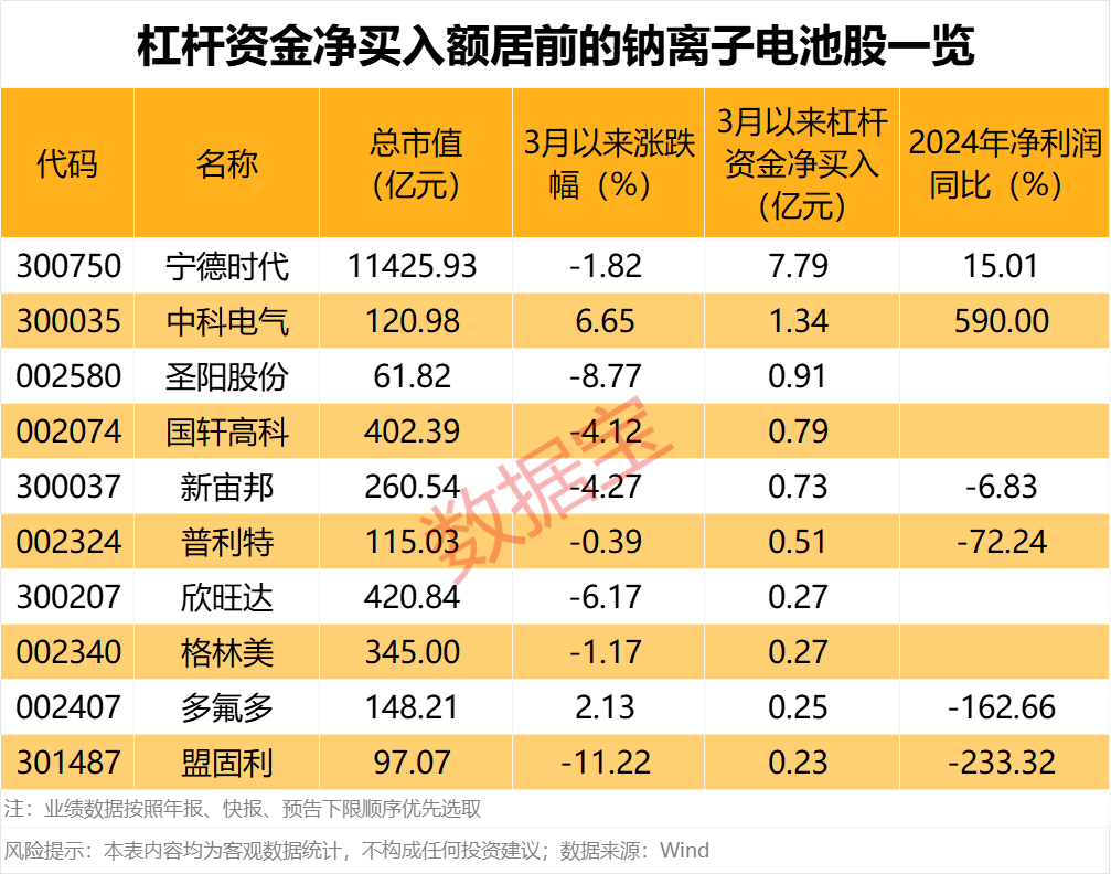 从资金面来看,3月以来,超半数钠离子电池概念股获得杠杆资金加仓,其中宁德时代、中科电气、圣阳股份、国轩高科的净买入额居前。