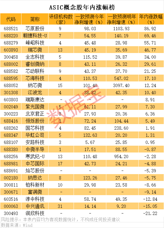 从未来成长性来看,根据机构一致预测,全志科技、芯海科技、寒武纪-U、芯原股份等个股今明两年净利增速均有望超30%,华虹公司、纳思达、紫光国微等个股今明两年净利增速均有望超20%。从股价表现来看,相对纯正的ASIC芯片股票表现更好,芯原股份年内大涨近87%,翱捷科技-U大涨逾69%。