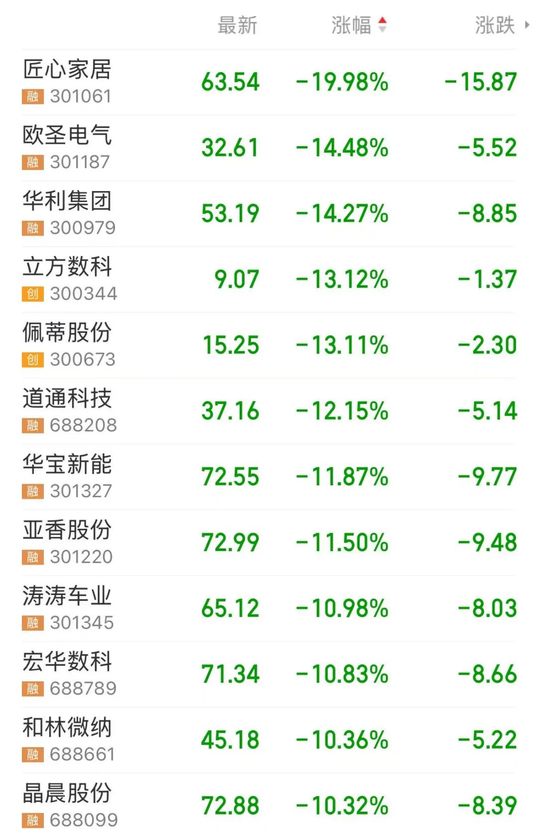 其他个股方面,匠心家居“20cm”跌停,华利集团、欧圣电气均跌超14%,巨星科技、春风动力等众多个股跌停。