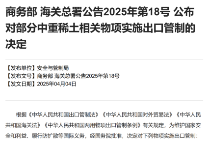 2025年4月4日,商务部会同海关总署发布关于对钐、钆、铽、镝、镥、钪、钇等7类中重稀土相关物项实施出口管制措施的公告,并于发布之日起正式实施。