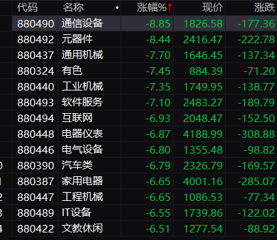 各大板块全线下跌,通信设备、元器件、通用机械、有色等多个板块开盘跌幅超过7%。