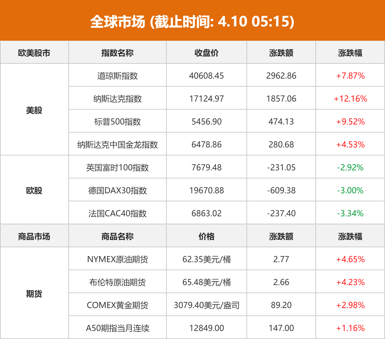 美股市场:美股三大指数收盘集体暴涨。美国总统特朗普当地时间9日表示,已授权对不采取报复行动的国家实施90天的关税暂停,受此影响,美股盘中大幅拉升。截至当天收盘,道琼斯工业平均指数比前一交易日上涨2962.86点,收于40608.45点,涨幅为7.87%;标准普尔500种股票指数上涨474.13点,收于5456.90点,涨幅为9.52%,录得2008年10月28日以来最大单日百分比涨幅;纳斯达克综合指数上涨1857.06点,收于17124.97点,涨幅为12.16%,创2001年1月3日以来最大单日百分比涨幅,为第二大历史纪录涨幅。