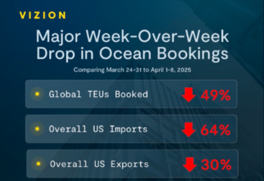 货运数据公司Vizion对比2025年3月24日—31日与随后一周(4月1日—8日)的数据,全部的预订标准箱数量环比大幅下跌49%,美国整体进口数量环比大幅下跌64%。分析称,关税已引发巨大不确定性,托运人在条件发生变化时紧急踩刹车。