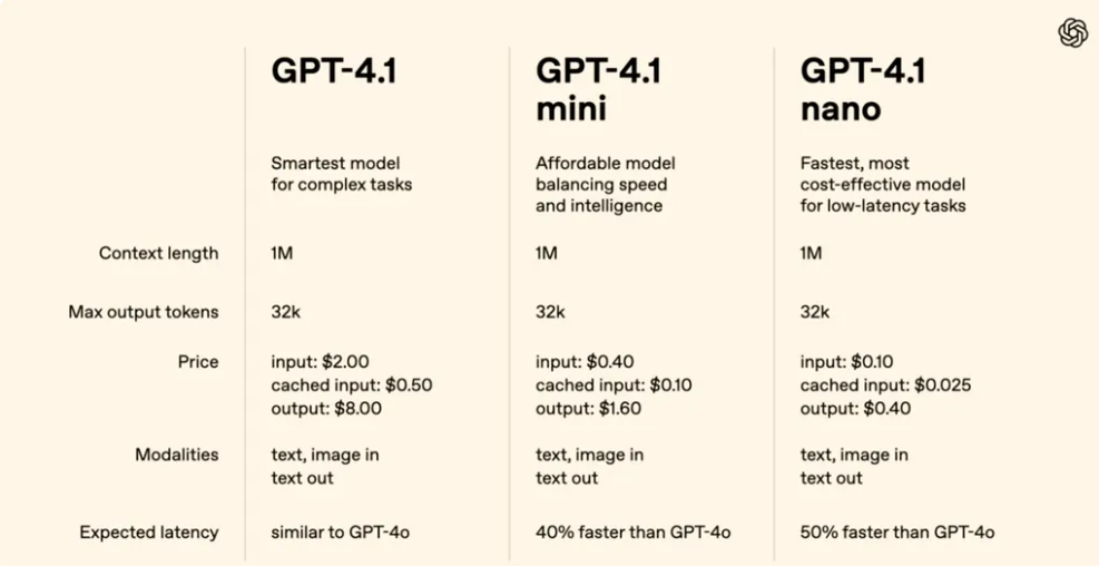 价格方面,GPT-4.1系列在性能提升的同时,价格更具竞争力。GPT-4.1相比GPT-4o价格降低26%,而GPT-4.1 Nano作为最小、最快且最便宜的模型,每百万token的成本仅为12美分。