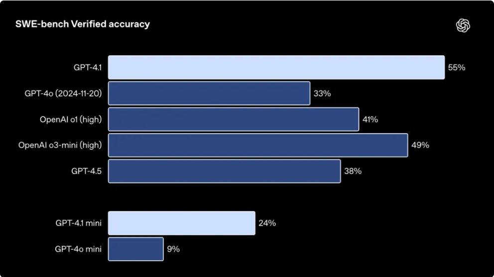 测试结果显示,GPT-4.1在处理长达128K tokens的数据时显著优于GPT-4o,并且在长达100万tokens的上下文中依然能够保持较高的性能。在编码能力测试中,SWEBench评估将模型置于Python代码库环境,让其探索代码库、编写代码和测试用例。结果显示,GPT-4.1的准确率达到55%,而GPT-4o仅为33%。