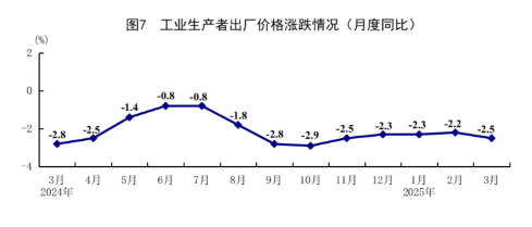 一季度,全国工业生产者出厂价格同比下降2.3%。其中,3月份同比下降2.5%,环比下降0.4%。一季度,工业生产者购进价格同比下降2.3%。其中,3月份同比下降2.4%,环比下降0.2%。