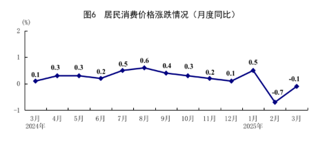 一季度,全国居民消费价格(CPI)同比下降0.1%。分类别看,食品烟酒价格下降0.7%,衣着价格上涨1.2%,居住价格上涨0.1%,生活用品及服务价格下降0.4%,交通通信价格下降1.9%,教育文化娱乐价格上涨0.7%,医疗保健价格上涨0.3%,其他用品及服务价格上涨6.0%。在食品烟酒价格中,鲜菜价格下降5.9%,粮食价格下降1.4%,鲜果价格下降0.1%,猪肉价格上涨8.1%。扣除食品和能源价格后的核心CPI同比上涨0.3%。3月份,全国居民消费价格同比下降0.1%,降幅比上月收窄0.6个百分点;环比下降0.4%。
