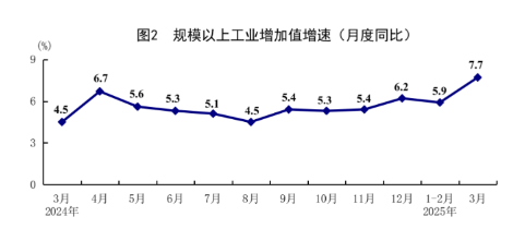 一季度,全国规模以上工业增加值同比增长6.5%,比上年全年加快0.7个百分点。分三大门类看,采矿业增加值同比增长6.2%,制造业增长7.1%,电力、热力、燃气及水生产和供应业增长1.9%。装备制造业增加值同比增长10.9%,比上年全年加快3.2个百分点;高技术制造业增加值增长9.7%,加快0.8个百分点。分经济类型看,国有控股企业增加值同比增长4.2%;股份制企业增长7.2%,外商及港澳台投资企业增长4.0%;私营企业增长7.3%。分产品看,新能源汽车、3D打印设备、工业机器人产品产量同比分别增长45.4%、44.9%、26.0%。3月份,规模以上工业增加值同比增长7.7%,比1-2月份加快1.8个百分点;环比增长0.44%。3月份,制造业采购经理指数为50.5%,比上月上升0.3个百分点;企业生产经营活动预期指数为53.8%。1-2月份,全国规模以上工业企业实现利润总额9110亿元,同比下降0.3%,降幅比上年全年收窄3.0个百分点。