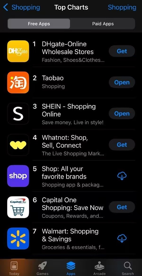 至此,美国iOS应用商店电商应用榜单前三均为中国APP,第一为敦煌网,第二为淘宝,第三为SHEIN。