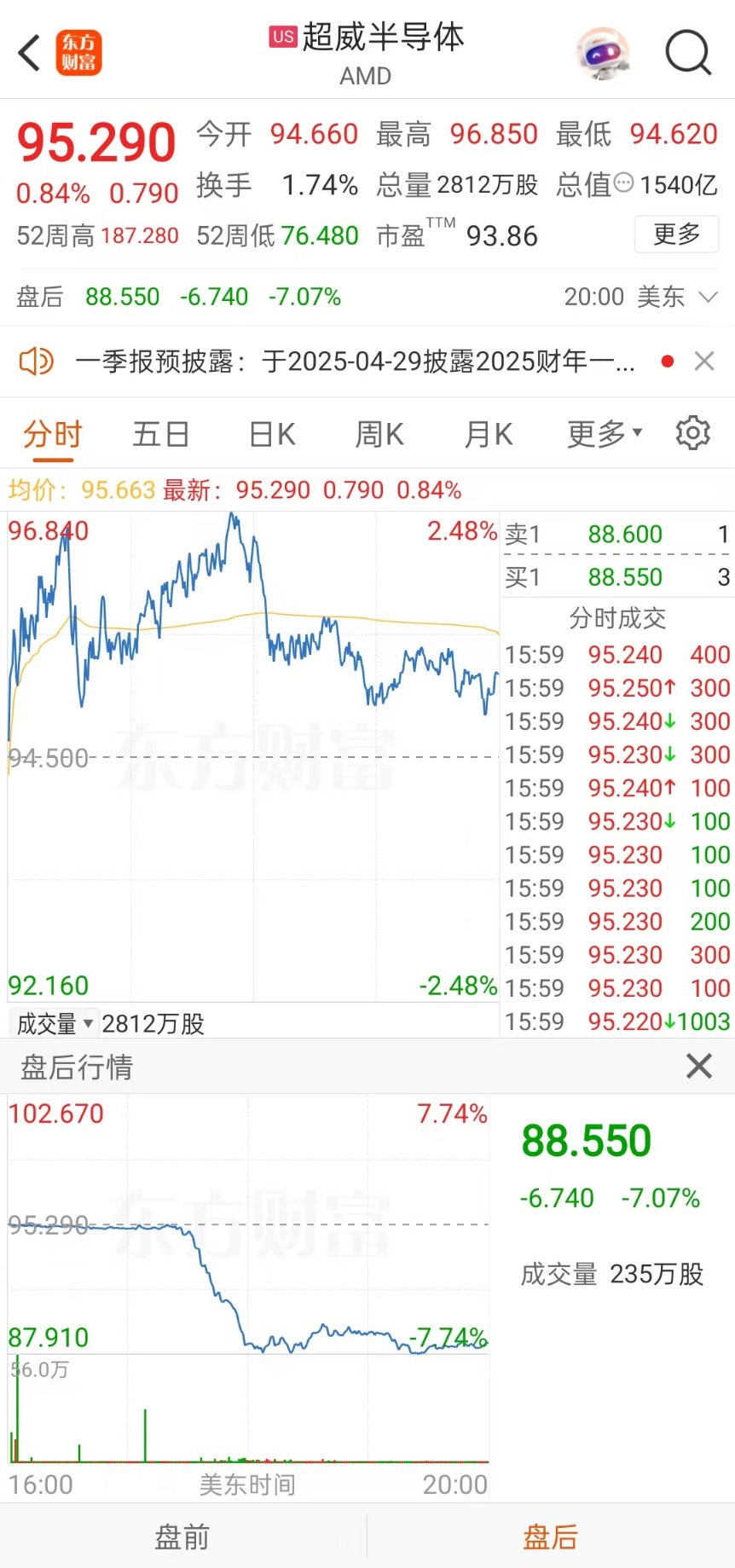 美股盘后,AMD一度跌超7%。博通跌4%,美光科技跌3.7%,台积电ADR跌3.2%,Palantir跌2.2%,英特尔跌1.7%,C3.ai跌1.7%,特斯拉跌1.4%,苹果跌1.3%,高通和Meta也跌超1%。