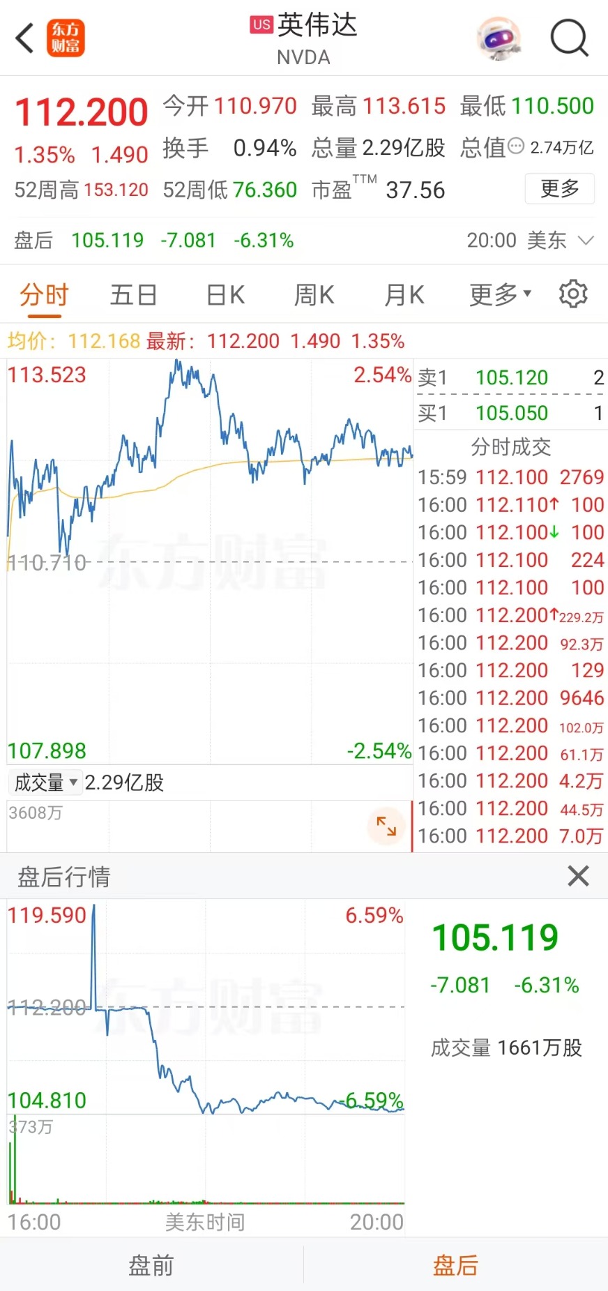 北京时间4月16日,截至发稿,英伟达美股盘后持续走低,现跌6.52%,报104.89美元,市值一度蒸发1784亿美元(约合人民币13051亿元)。