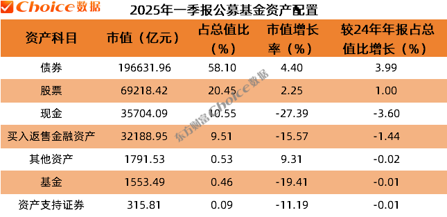 Choice数据显示,截至2025年一季度末,基金持有量最多的资产类型为债券,持有市值19.66万亿元,占基金资产总值比例58.1%;其次为股票,持有市值6.92万亿元,占比20.45%。