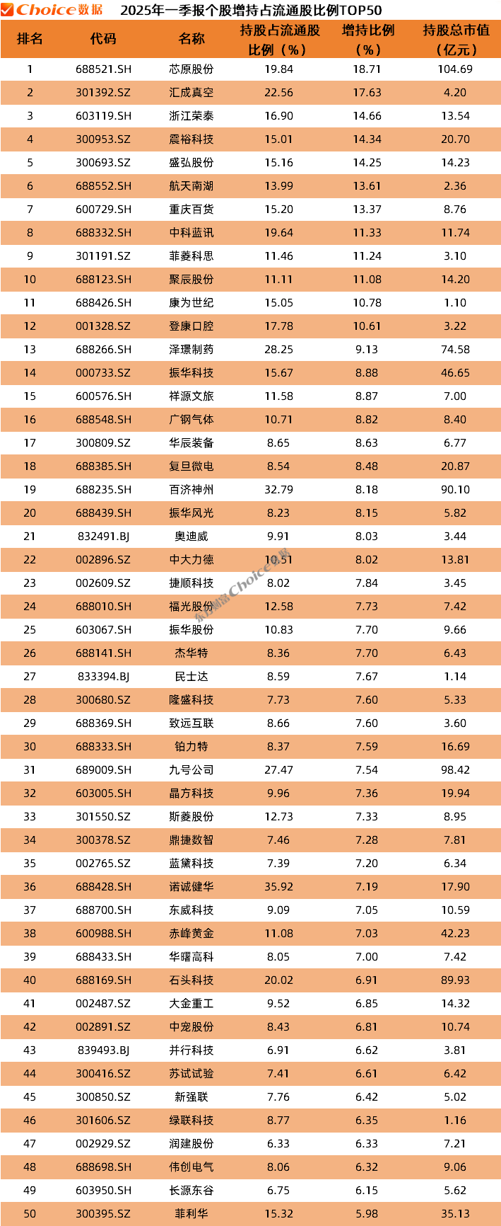 在个股占流通股比例增持TOP50的榜单中,芯原股份位列第一,2025年一季度末基金持股占流通股比例从2024年末的1.13%增加至19.84%,增持了18.71%,持股数达到9898.41万股,总市值104.69亿元。