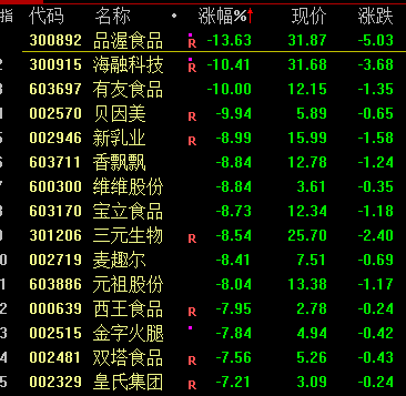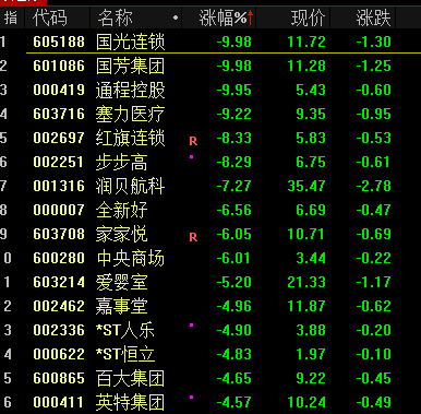 下跌方面,食品、零售等消费股全线调整,有友食品、贝因美、国光连锁等跌停。