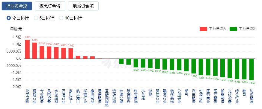 行业资金方面,截至收盘,化学原料、钢铁行业、专业服务等净流入排名靠前,其中化学原料净流入1.32亿。