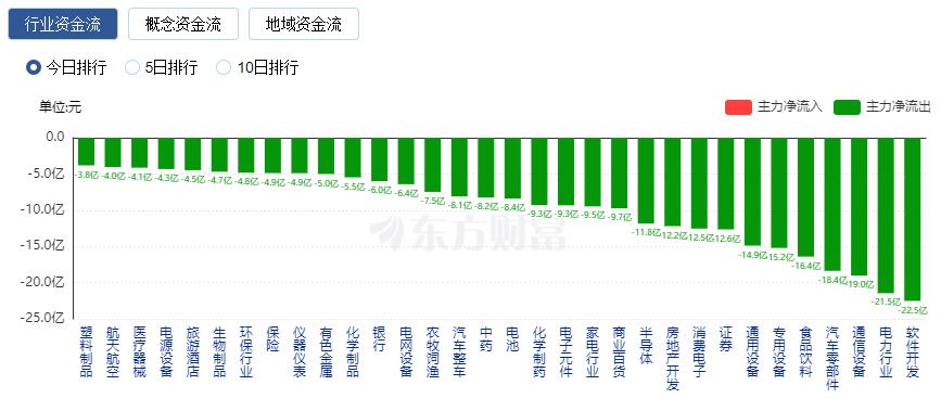 净流出方面,软件开发、电力行业、通信设备等净流出排名靠前,其中软件开发净流出22.52亿元。