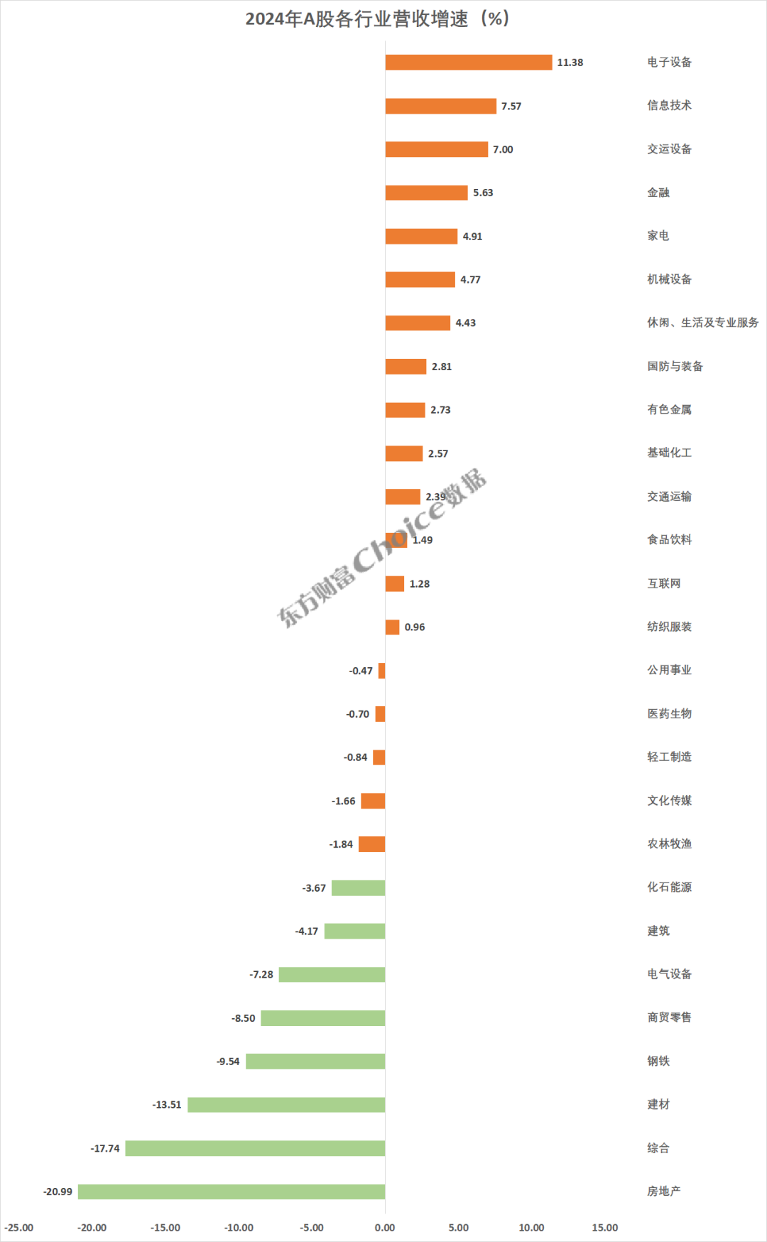 行业营收增速方面,27个东财一级行业中,电子设备营收增速最快,达到11.38%;信息技术、交运设备排名第二、第三,分别为7.57%、7%。房地产、建材等行业2024年营收下降超10%。