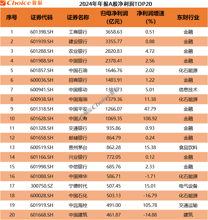 归母净利润方面,金融、石油行业占据榜单前六名,工商银行以3658.63亿元位居2024年A股利润榜首位;建设银行、农业银行、中国银行分别以3355.77亿元、2820.83亿元、2378.41亿元排名第二至第四。中国石油、招商银行、中国移动、中国海油、中国平安、中国人寿净利润均超过1000亿元。