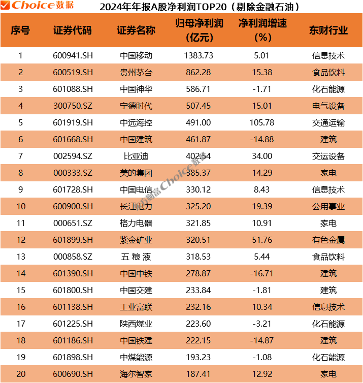 剔除金融石油,中国移动、贵州茅台、中国神华、宁德时代、中远海控排名利润榜前五。