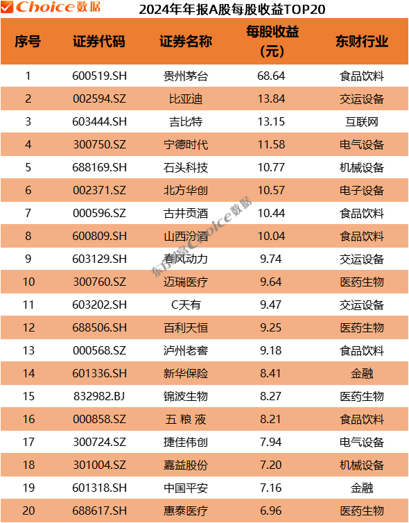 每股收益方面,2024年排名第一的是贵州茅台,基本每股收益为68.64元,比亚迪、吉比特、宁德时代排名第二、第三、第四,每股收益均超过11元。