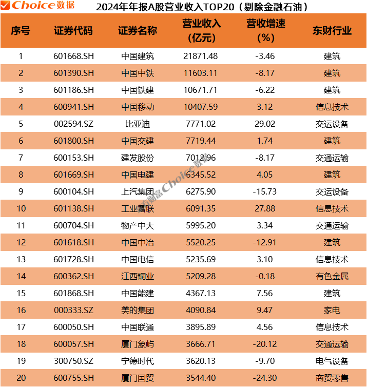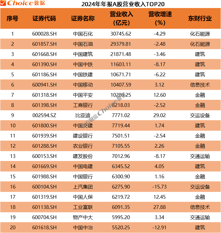 2024年,A股共7家公司营业总收入超过1万亿元。其中,两桶油营业总收入分别为30745.62亿元、29379.81亿元,牢牢占据A股营收榜单前两位;中国建筑以21871.48亿元的营收位居第三,中国中铁、中国铁建、中国移动、中国平安营收均超过1万亿元。