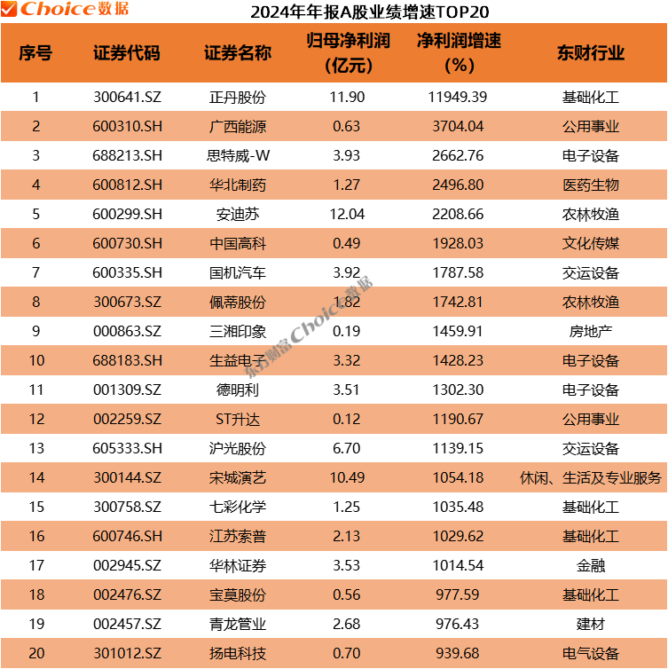 2024年,17家公司净利润增速超过10倍,业绩增速最快的是正丹股份,达到11949.39%;广西能源、思特威-W业绩增速分别为3704.04%、2662.76%。