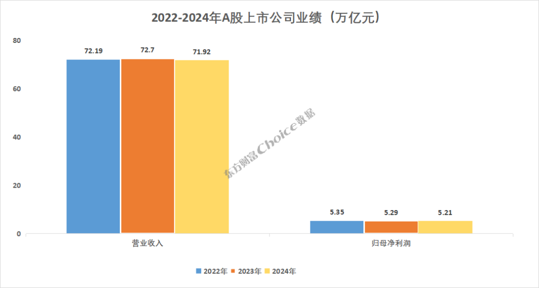 总体来看,2024年所有已披露财报的A股上市公司合计实现营业总收入71.92万亿元,同比下降1.07%;合计归属母公司股东净利润5.21万亿元,同比下降1.51%。