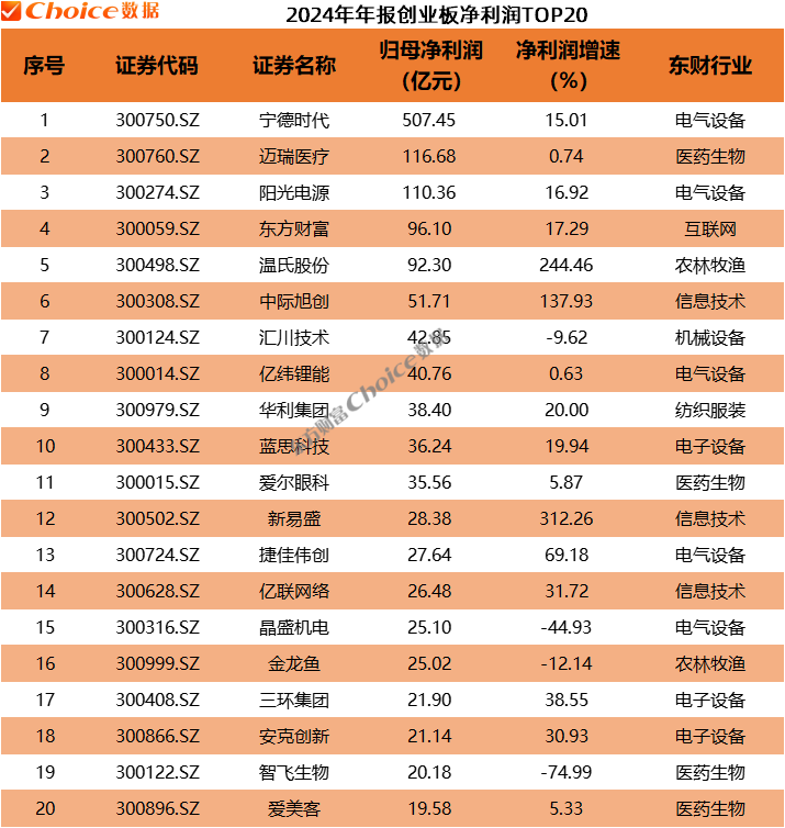 创业板方面,宁德时代以507.45亿元的净利润位居创业板2024年度“盈利王”;迈瑞医疗、阳光电源位居第二、第三,均超百亿;温氏股份、中际旭创、新易盛净利润增长超100%。