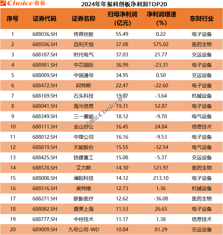 科创板“盈利王”是传音控股,归母净利润达到55.49亿元,百利天恒、时代电气位居第二、第三。