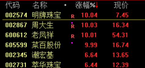 大消费概念股领涨,欢乐家、会稽山、友阿股份、均瑶健康、明牌珠宝、国芳集团等多股涨停。