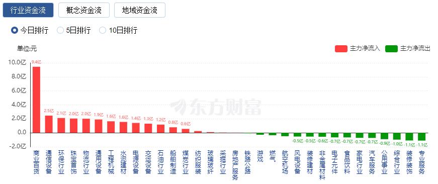 行业资金方面,截至收盘,商业百货、通信设备、环保行业等净流入排名靠前,其中商业百货净流入9.44亿。